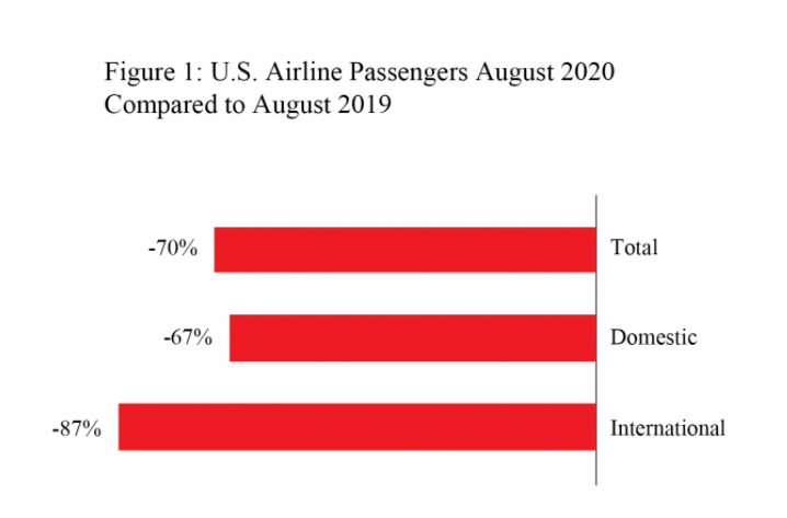 The Bureau of Transportation Statistics reported that US airline passenger traffic in August 2020 is down by 70% from a year earlier. In other words, the US is running at less than a third the number of passengers compared to a year ago. And, this was the smallest decrease since March.