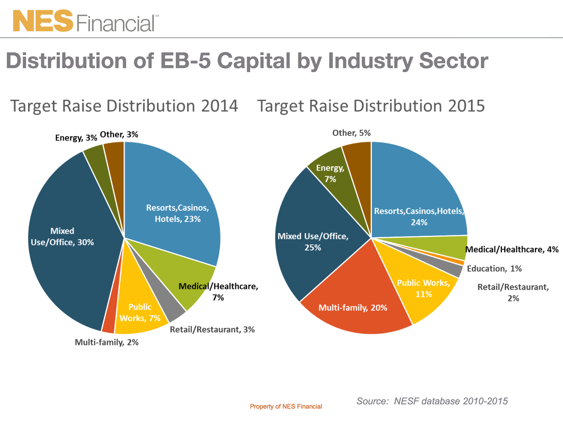 Note that, in terms of capital raised, public works greatly exceeded retail/restaurant. Again, the growth in EB-5 financing for multifamily was explosive! In terms of capital raised, multifamily barely registered on the scale in 2014, but almost equaled the other top two leaders in 2015. This is an amazing growth.