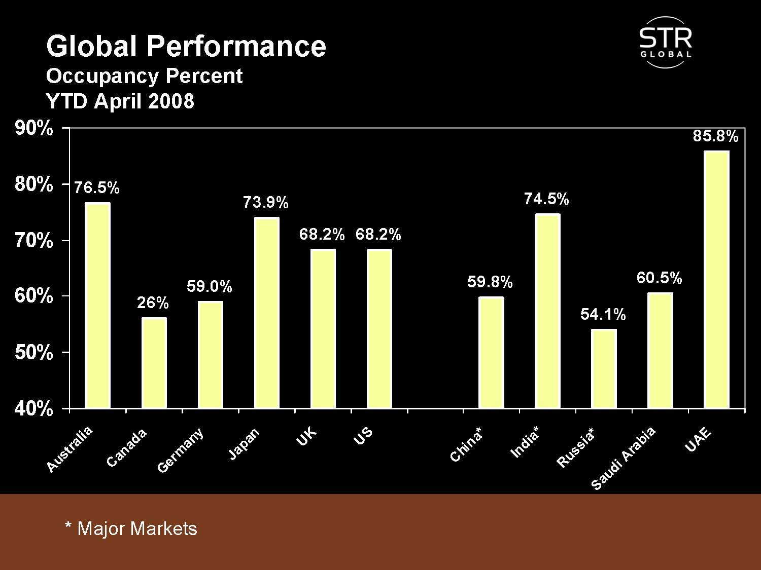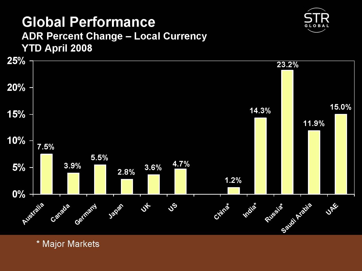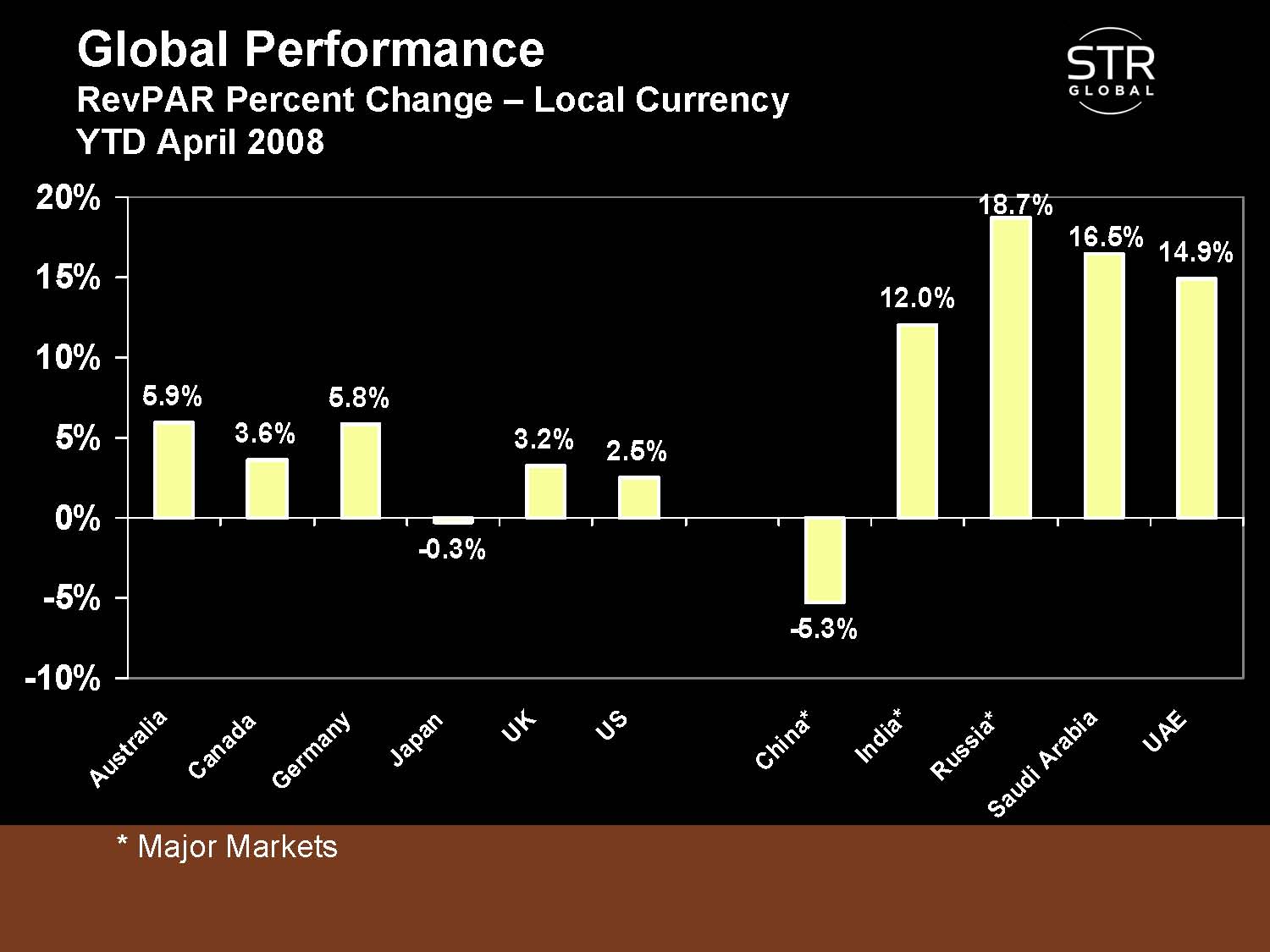 These first three slides from Smith Travel Research show how occupancies, ADRs in local currencies, and RevPARs in local currencies compare among a number of major hotel markets.
