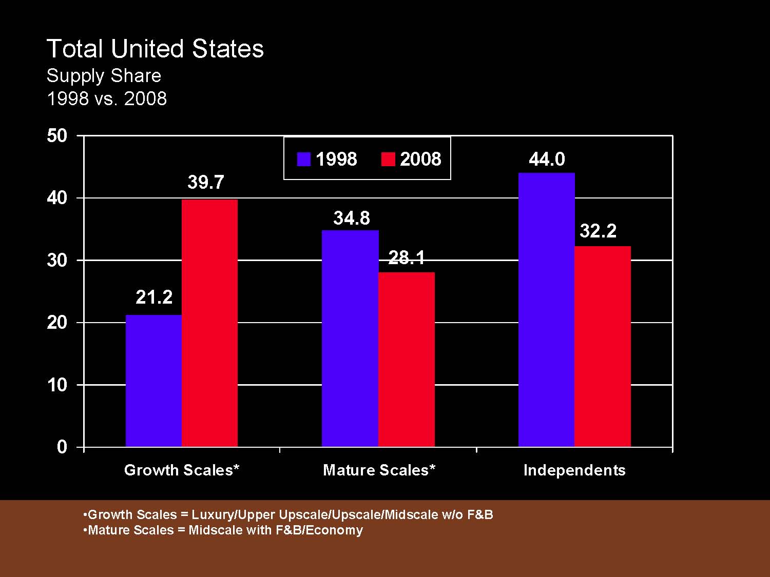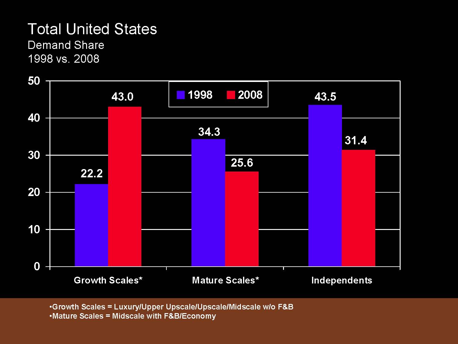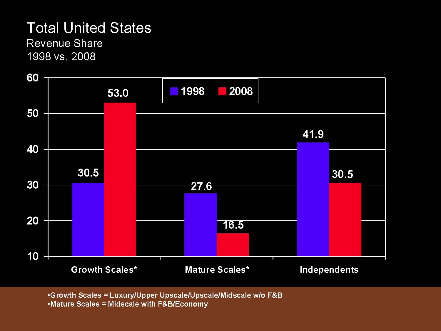 Lomanno’s conclusion? The Growth Scales will fare disproportionately better in any downturn or upturn! (He says that this should not be surprising, because the most cost conscious are the people who are ground zero of the subprime crisis, and they are most likely to use the Mature Scales — economy and midscale with F&B — so their cutbacks will hit these segments heavily.) Lomanno expects the Growth Scales will soon have 60-65% of the supply!