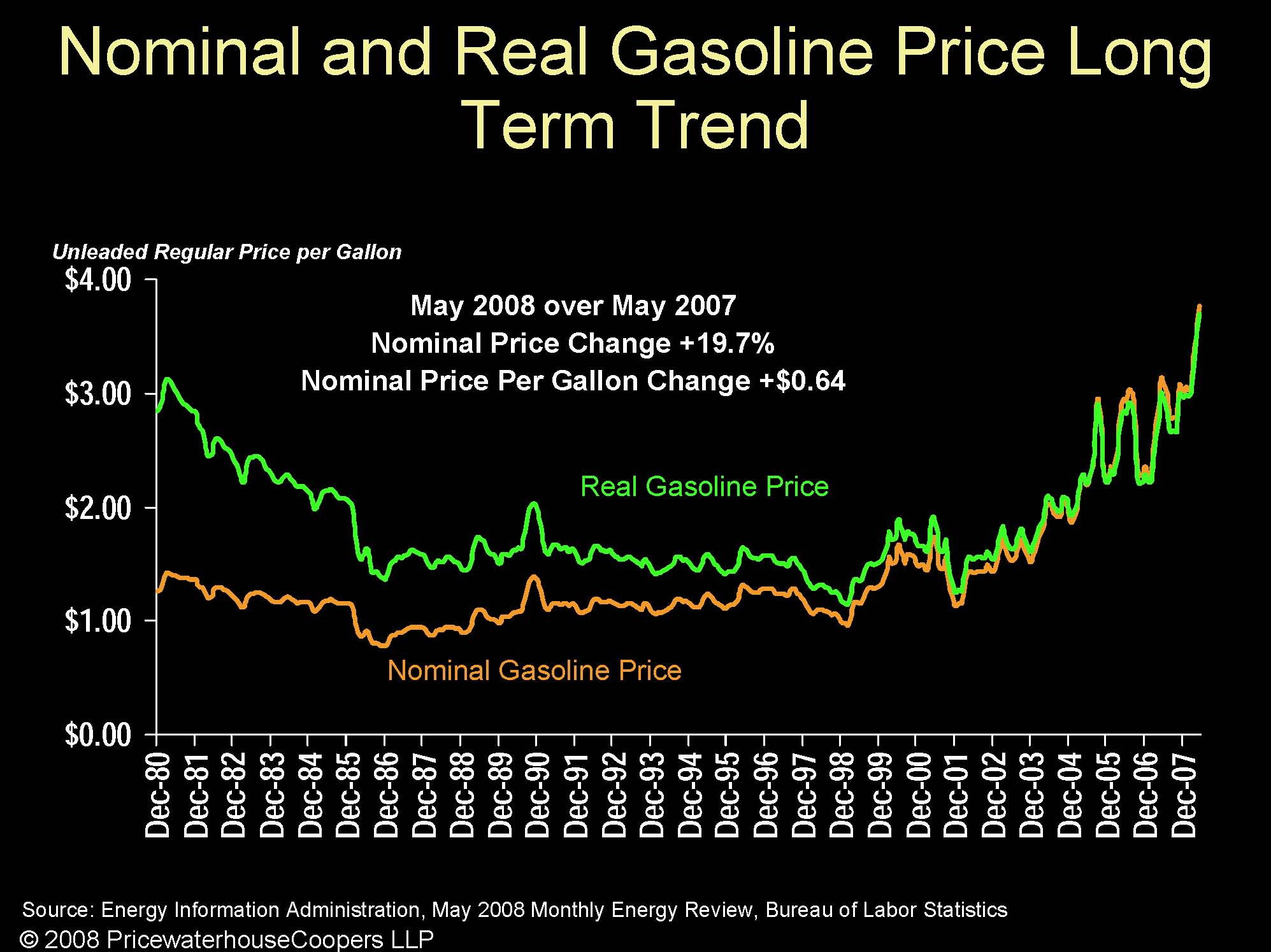 And what is the relationship? PwC has calculated that when real gasoline prices increase by 10%, U.S. lodging demand declines by 0.5%. And to put this into a practical context, Bjorn says that if real gasoline prices had remained at the levels they held in the fourth quarter of 2006, then occupancy in 2007 would have been more than .2 occupancy points higher. And if the real price of gasoline remained at 2007 levels, occupancy in 2008 would be more than .4 occupancy points higher.