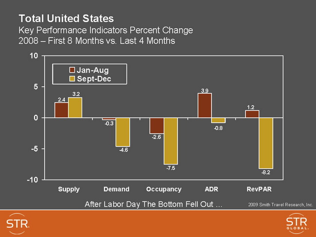 You really have to view 2008 as two distinct periods: The first 8 months of 2008 (from January through August) were not bad, and the last 4 months when the bottom fell out of the hotel industry. In the first part of the year, RevPAR was up 1.2 percent, but in the last part RevPAR fell 8.2%.