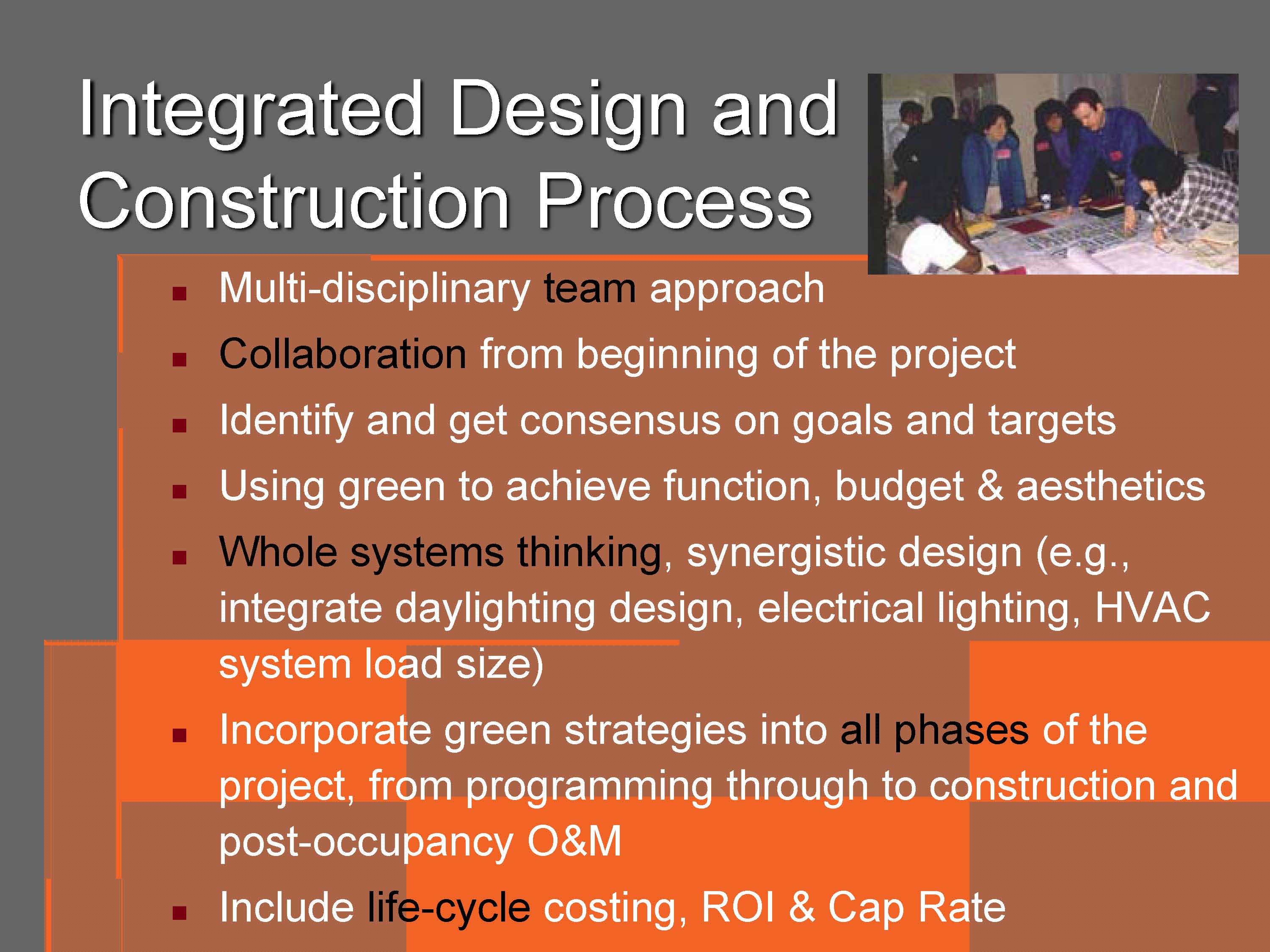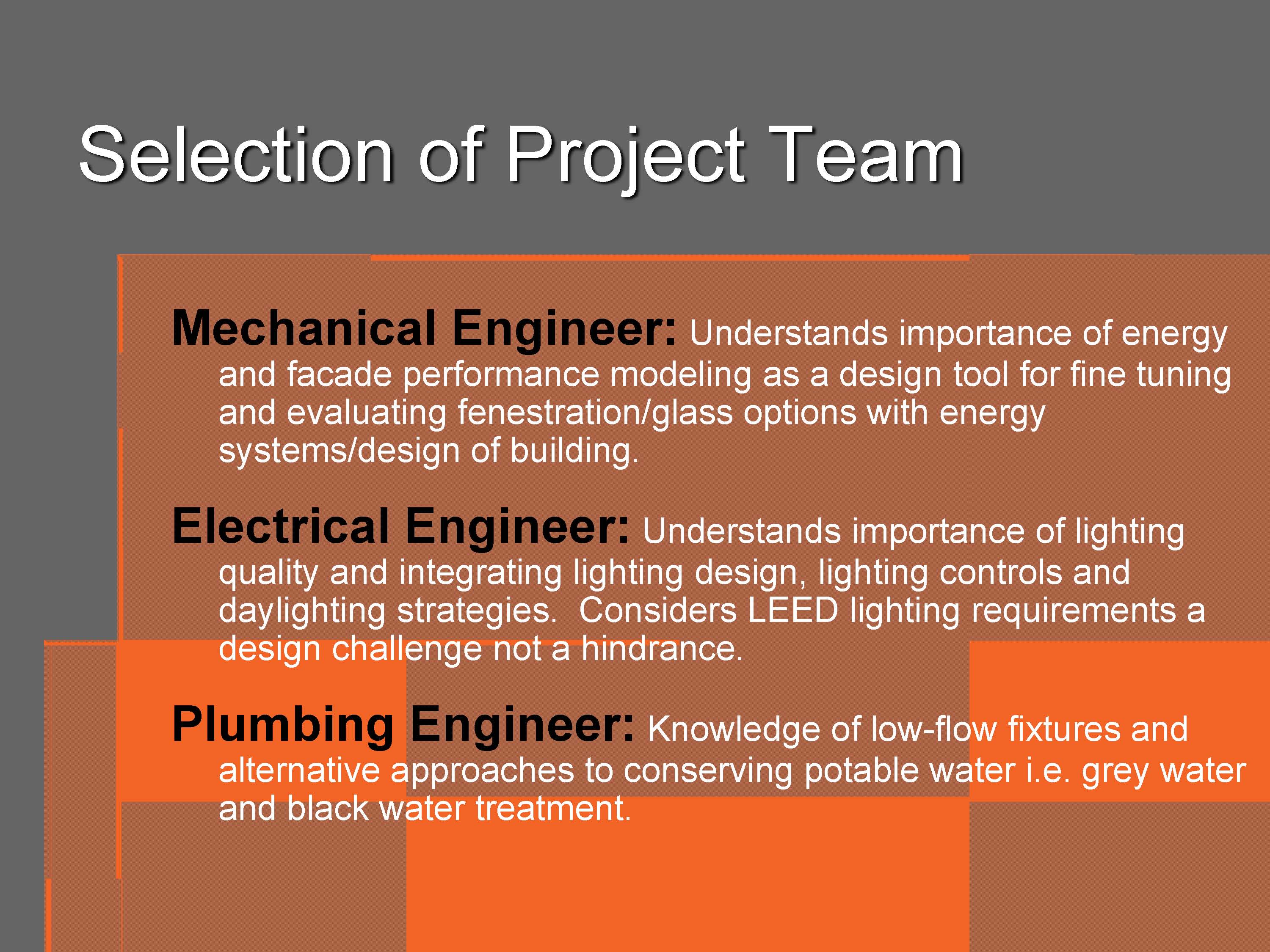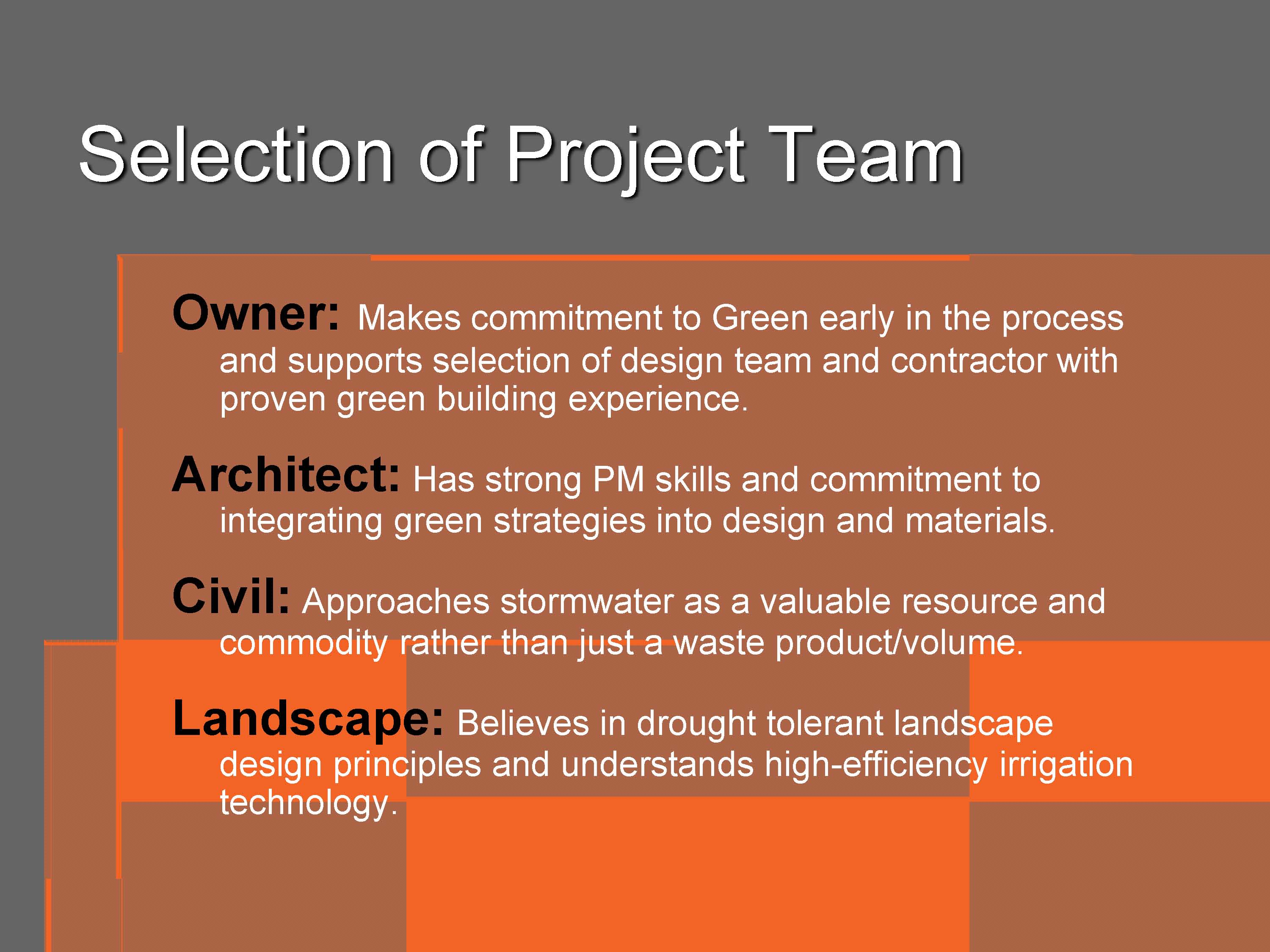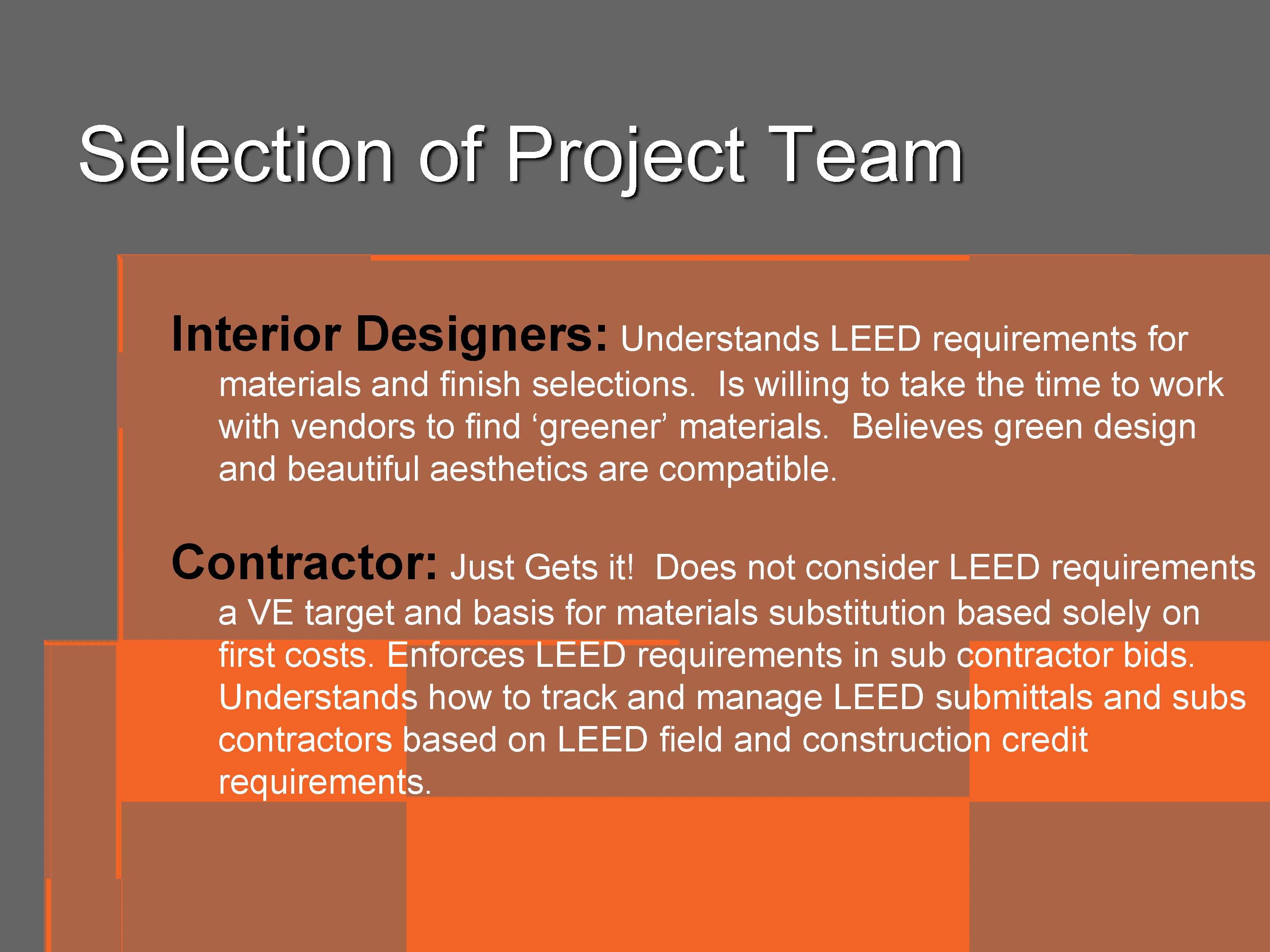 The ENTIRE project team should be selected based on their willingness to incorporate Green early in the process. This is a key aspect of an integrated approach. The owner should make a commitment to Green early on in the process and encourage the Project Team to use innovative technologies to enhance the sustainable features of the project. The Project Team should be selected based on their ability to utilize existing Green practices/technologies and their willingness to implement them.