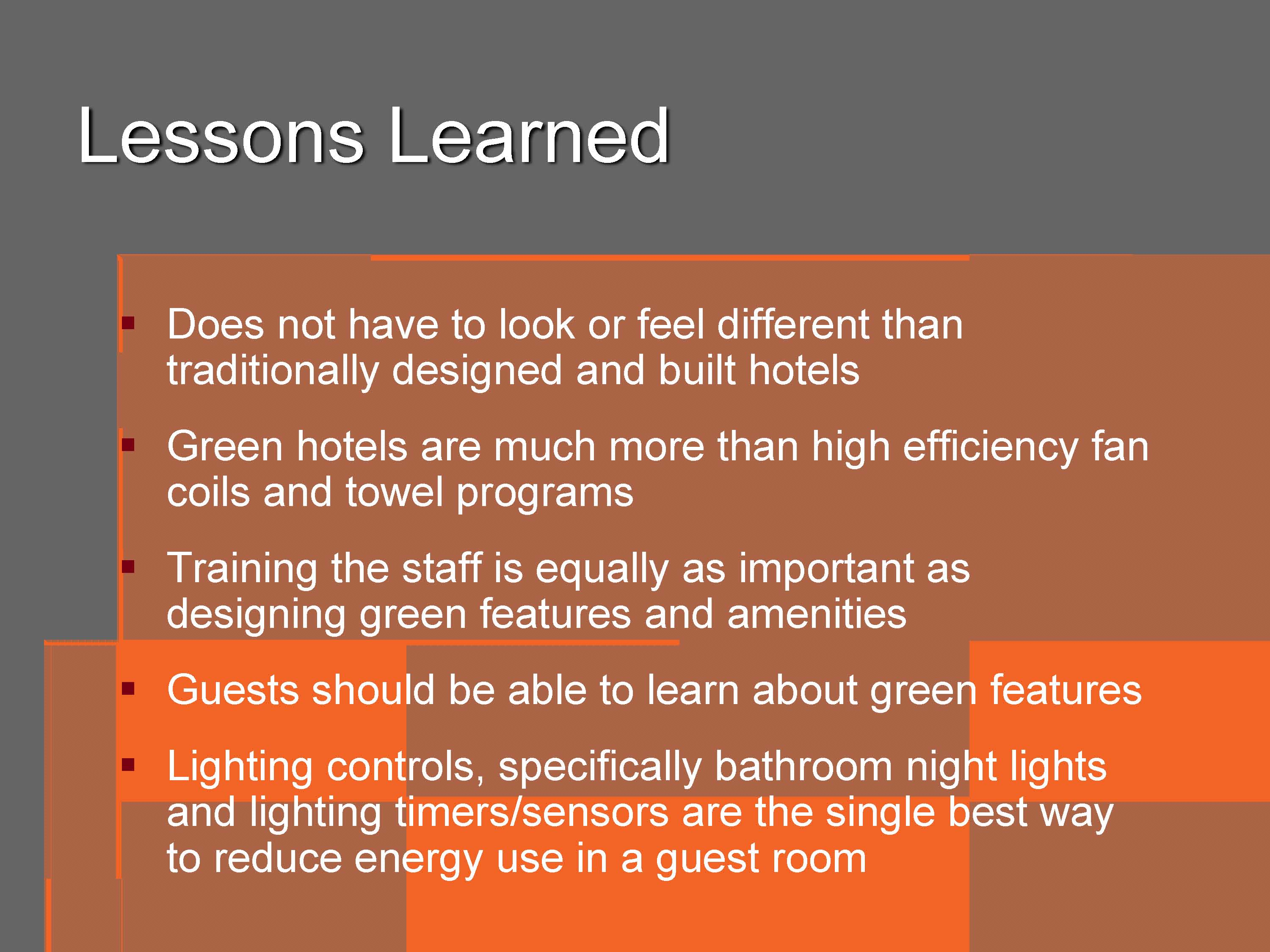 Though these three hotels differ dramatically in design, location, and client niche they share one vital commonality: a commitment to sustainability through LEED certification. I included this slide to show that LEED certification is a realistic possibility for all hotels willing to make the commitment.