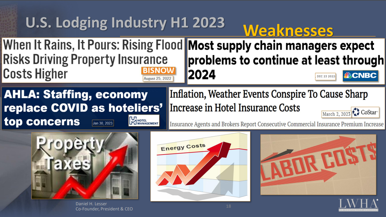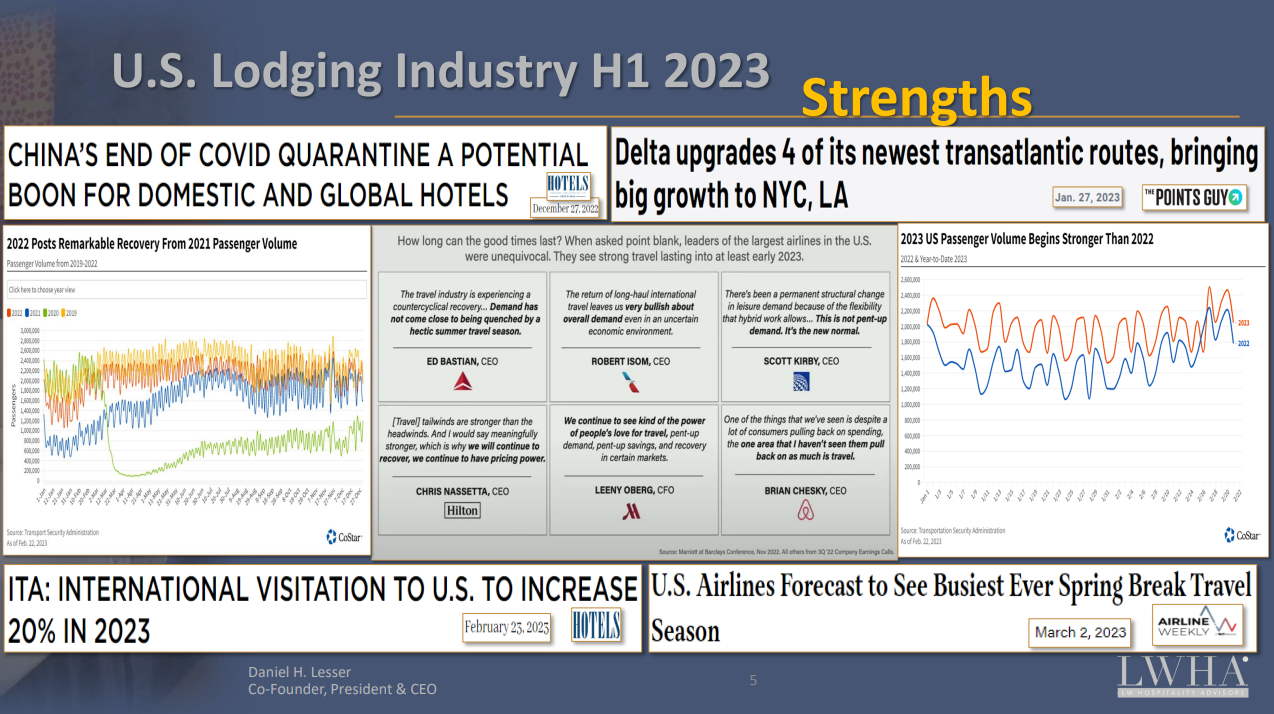 Daniel Lesser, President & CEO of LW Hospitality Advisors, kicked things off with a SWOT (strengths, weaknesses, opportunities and threats) analysis of the U.S. lodging industry in 2023.