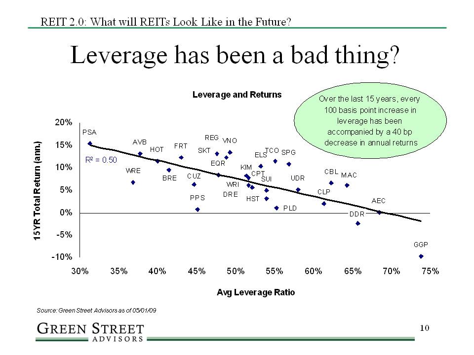 The implications are profound. More importantly, according to John, Institutional investors now believe the there is a direct correlation between increased leverage and decreased annual returns. They have been speaking about this for several weeks. They will demand lower leverage. Before we saw 40-50% leverage in REITs. John says, “We firmly believe that the REIT of tomorrow will operate on 20-25% leverage.”