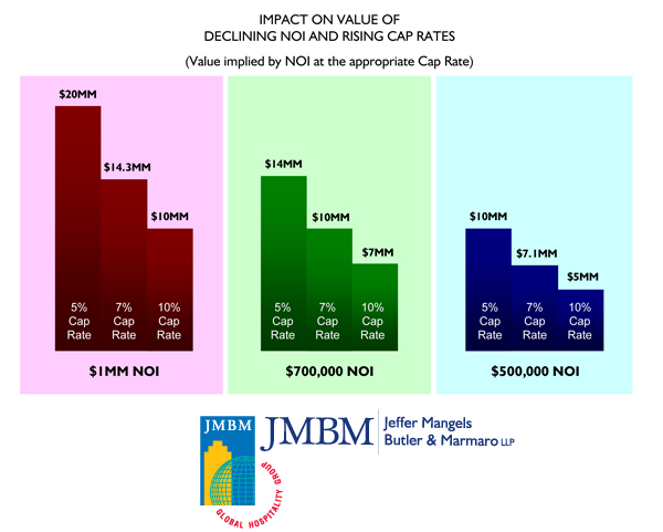 Of course it is worth remembering that many are now anticipating BOTH an increase in cap rates AND a decrease in NOI. Therefore, it is entirely possible that a hotel valued only a year or two ago at $20 million (with $1 million of NOI at a 5% cap rate) could be worth only $5 million to $7 million at a 10% cap rate with a 50% or 30% reduction in NOI — down from the original $10 – 20 million based on 2007 NOI.