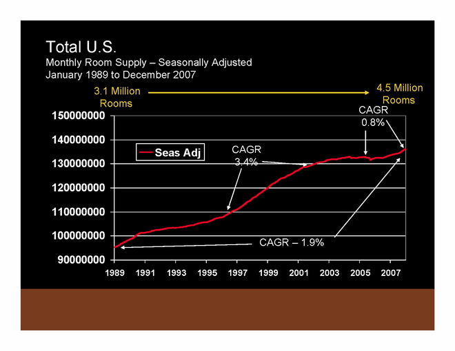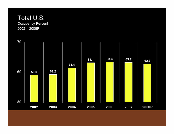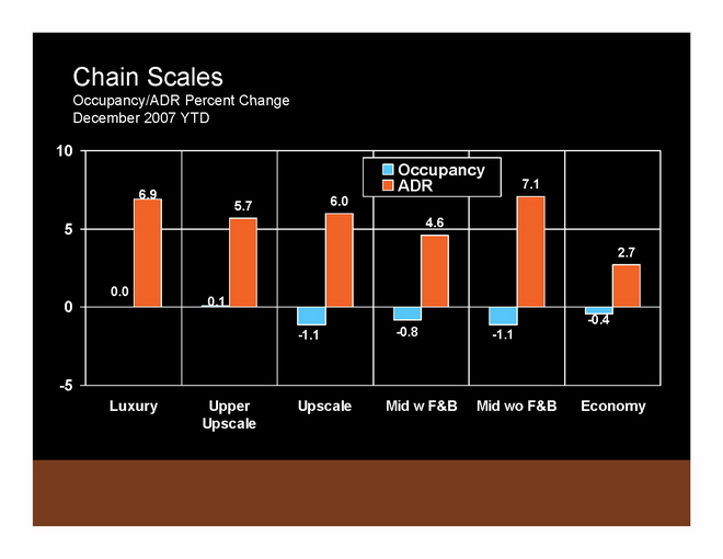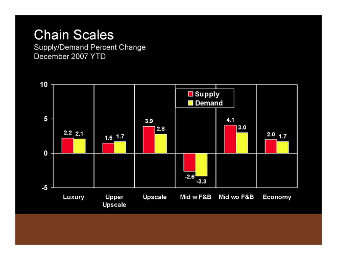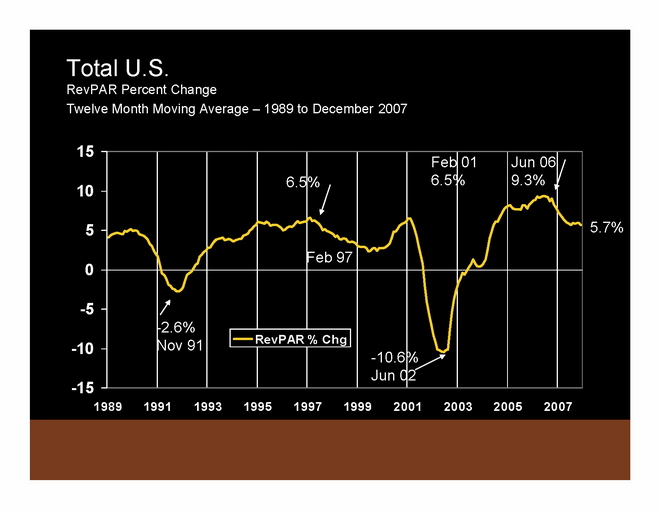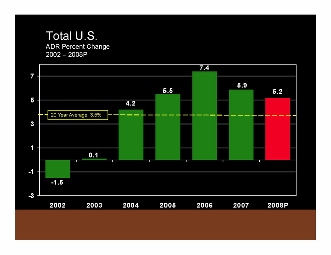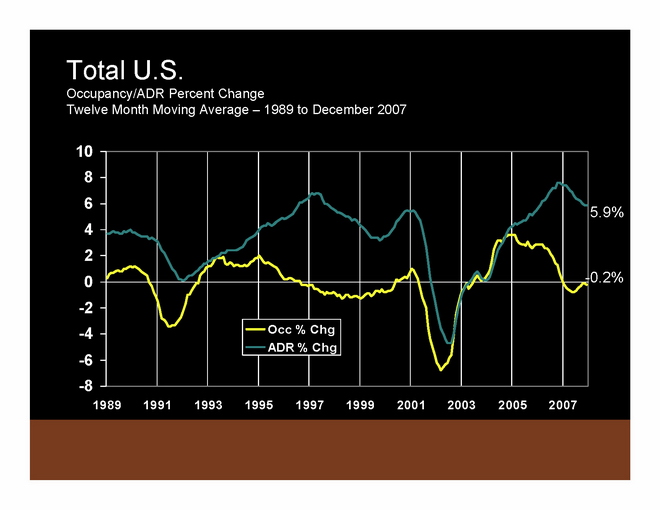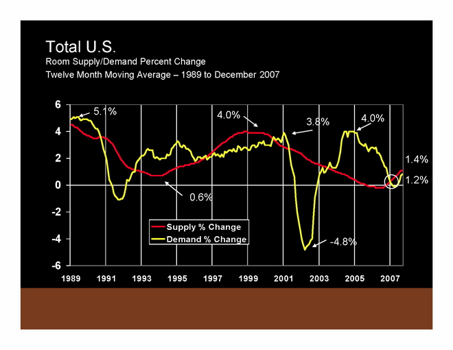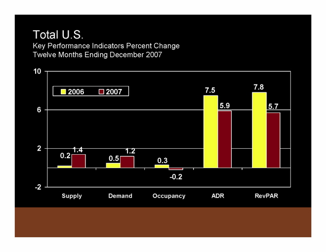 To summarize 2007 compared to 2006: In 2007, ADR was up 5.9% and RevPAR was up 5.7% from 2006 levels. These ADR and RevPAR growth rates are significantly above historic averages. Supply has popped up a little bit, but demand has also come back a bit. Occupancy continues to deteriorate slightly.