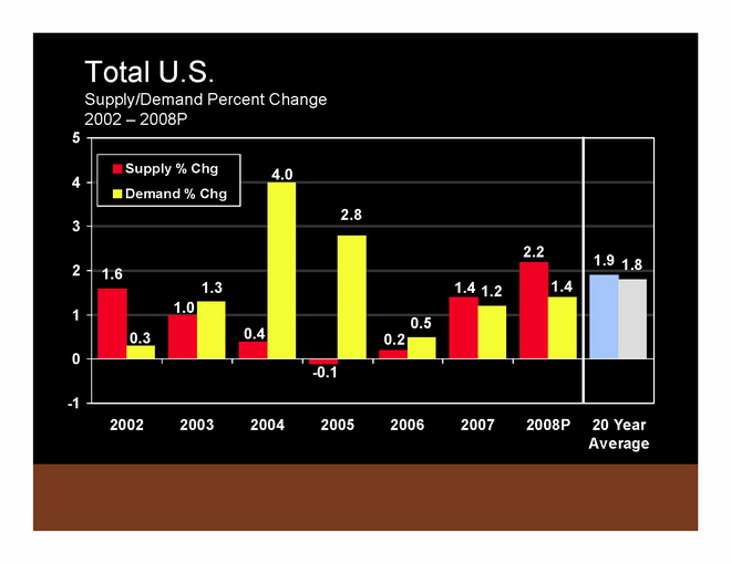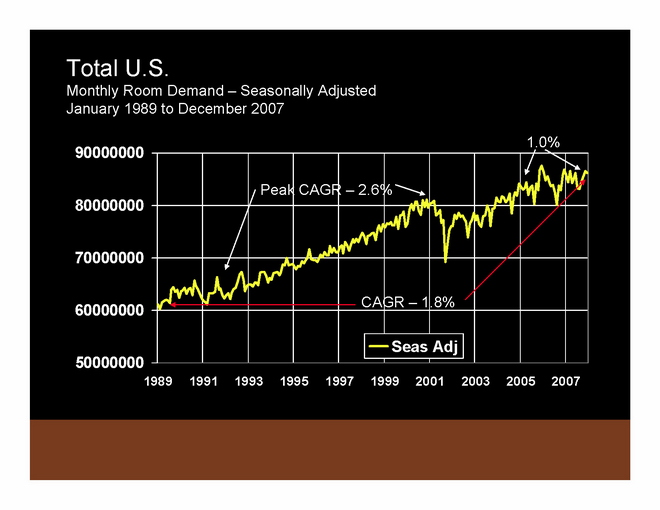 Demand. Over the past 20 years demand for hotel rooms has grown at an average annual rate of 1.8%. The demand situation has actually improved from .5% growth in 2006 to 1.2% growth in 2007.