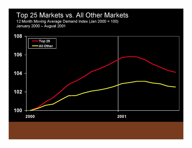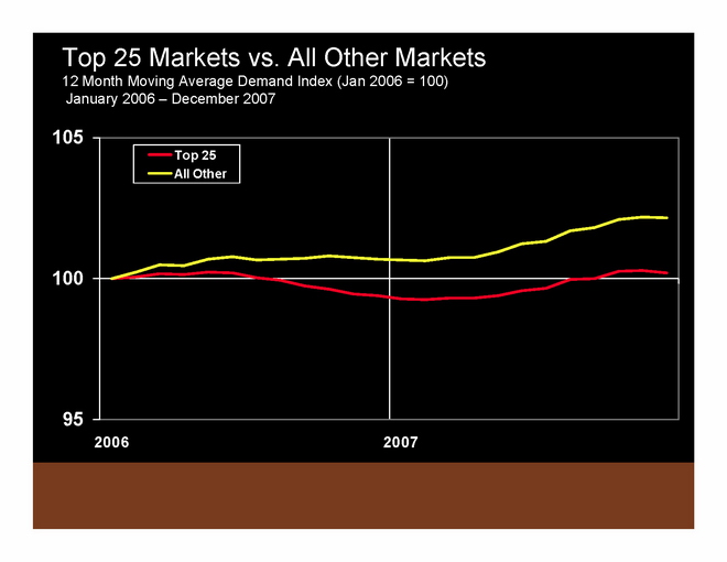 Performance of the Top 25 markets is shown in red. The first chart above shows supply. In 2000-2001, supply is growing faster in Top 25 markets than in all other markets. In 2005, that all started to change, and since 2005, supply has grown less fast in the Top 25 markets. In fact, rooms have actually come out of the market, and in 2006 the supply growth index for the Top 25 markets fell below all other markets. In the second chart above, you can see how demand started falling off faster for the Top 25 in early 2001.