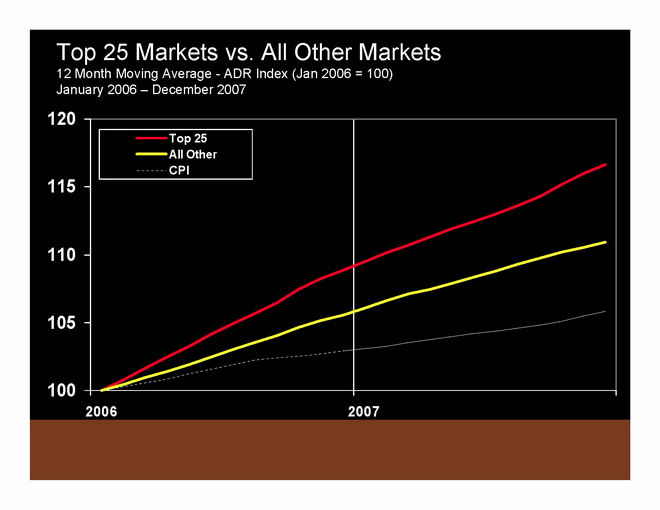 But as we look at 2006, we see that although the demand index for the Top 25 markets has been relatively flat (i.e. slowed down faster than the rest of the country), but with little supply growth, the ADR index for the Top 25 markets has been pulling away strongly from all other markets and from the CPI index. This bodes well for the Top 25 markets in coming months, and suggests that they will outperform all other markets, whether we have good times or more challenges.